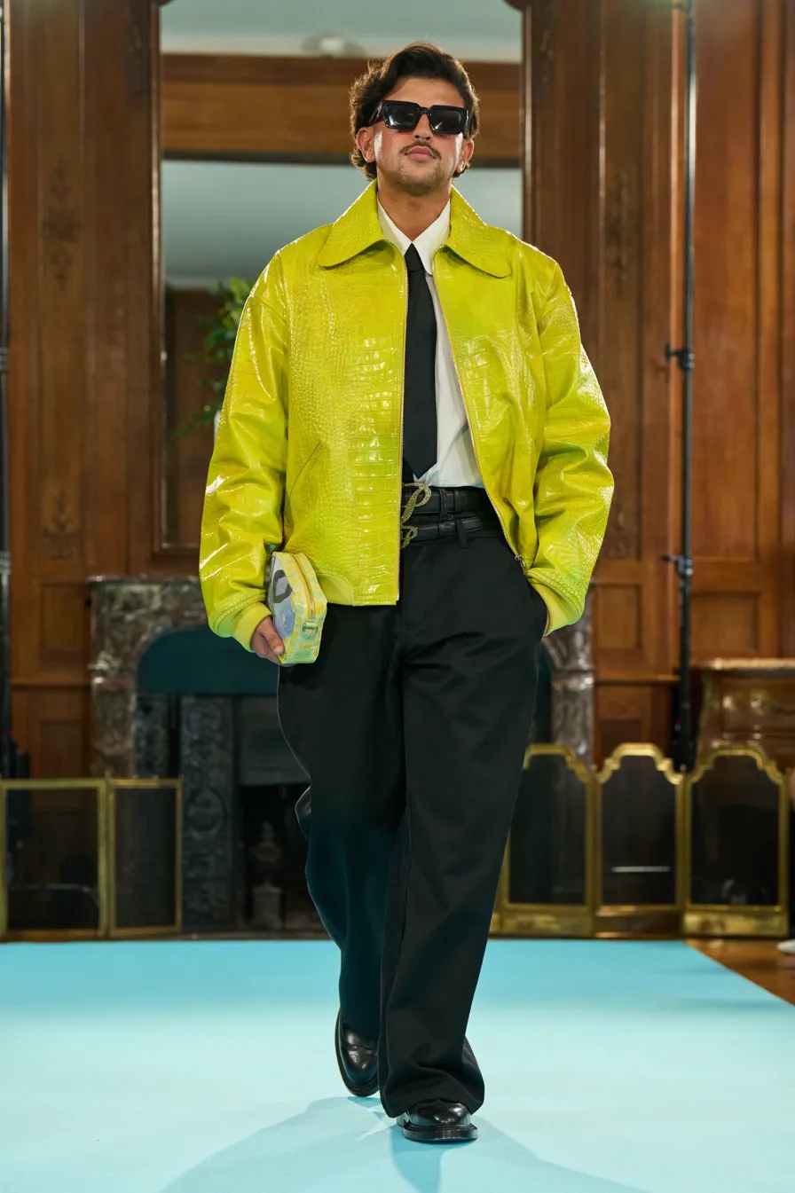 Visual: acid lime full saturation, oversized bomber, croc texture, black trouser discipline.